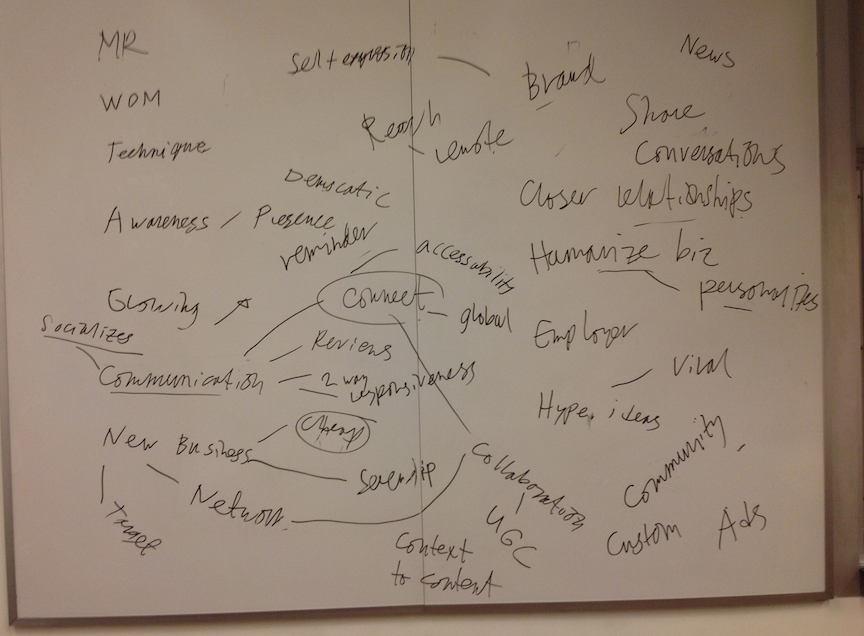 In my first social media marketing classes today, students were asked to identify various uses of social media, preferably with a business use case in mind. If you cannot read my handwriting… here comes some of the prominent uses of social media: